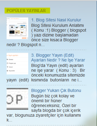 Popüler Yayınlar ismini birçok sitede görmüşsünüzdür.En çok izlenen yazılarınıza verilen bir link bağlantısıdır.Bloglarımızdada oldukça şık bir görünüm verdiği gibi, aynı zamanda yazılarınıza bağlantı oluşturması nedeni ile okuyucu kitleniz blogunuza geldiğinde ana sayfanızın sağ kısmında 10 ad. yazı bağlantılarını görür.